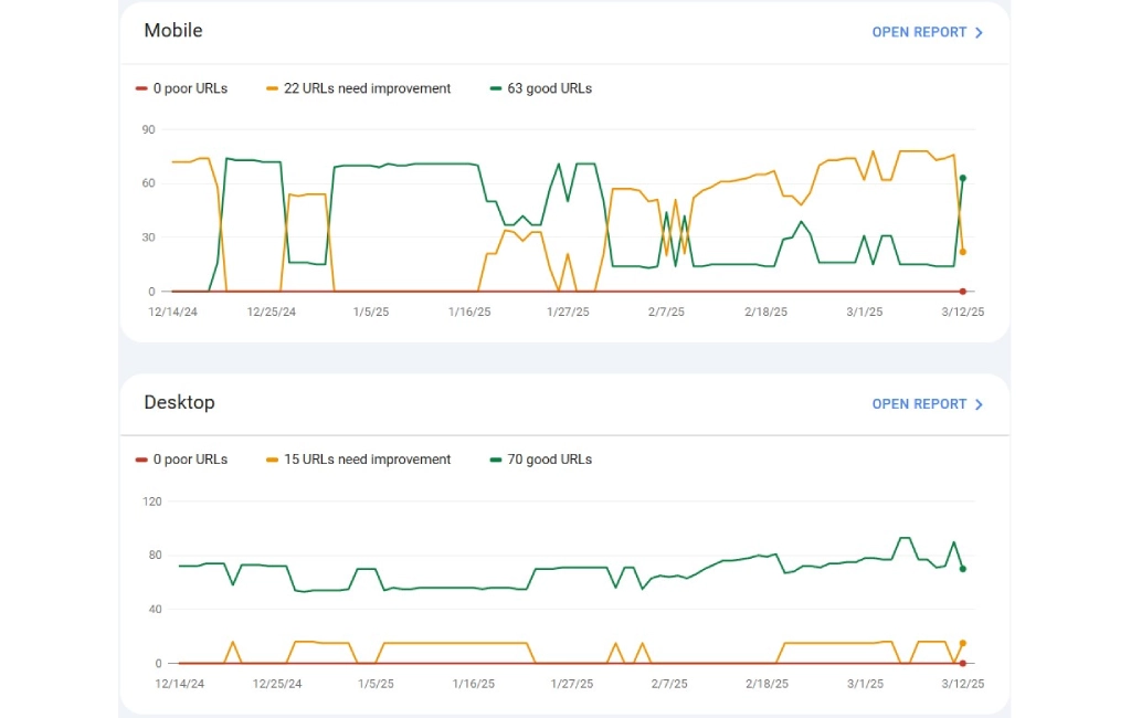 This website has shown strong technical SEO performance, with 63 mobile-friendly URLs and 70 well-optimized desktop URLs. Our continuous SEO efforts have ensured that there are 0 poor URLs on both mobile and desktop, establishing a solid foundation for usability and performance. However, 22 mobile URLs and 15 desktop URLs still need improvement for enhanced user experience and optimization. The ongoing trend indicates steady progress through performance adjustments and technical enhancements.