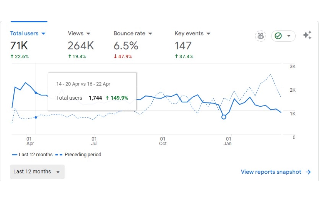 The website has experienced a significant increase in total users, reaching 71,000 visitors, a 22.6% growth compared to previous data. Additionally, page views have surged by 19.4%, indicating a higher level of engagement and visibility. These positive trends highlight the effectiveness of ongoing SEO and marketing strategies.